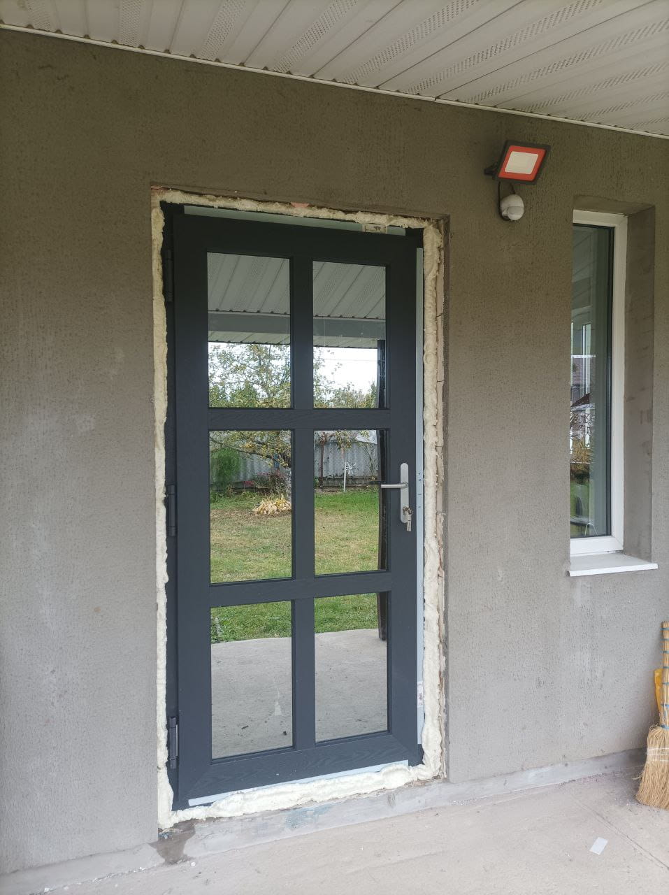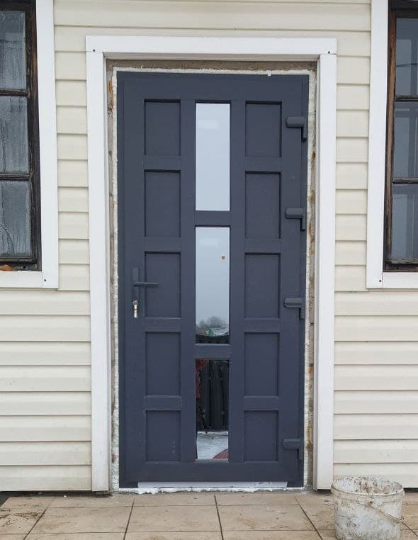 Входная дверь (дверной профиль КВЕ 70, наружная ламинация АНТРАЦИТ, рамный порог, двухкамерный стеклопакет СЕРЕБРО + ламинированный сендвич, четыре петли AVALON 7024) ВАЖНО!: вклейка заполнения обязательна при данной конфигурации двери. Дверь подлежит сервисному обслуживанию, но не является гарантийной.