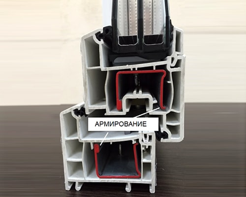 Армирование – это металлический профиль внутри профиля ПВХ. Толщина армирования в окнах ПВХ белого цвета 1,5 мм, в ламинированных изделиях 2,0 мм, в дверях из дверного профиля 2,5 мм.
