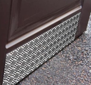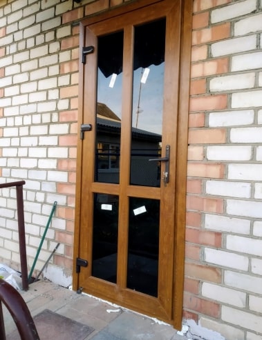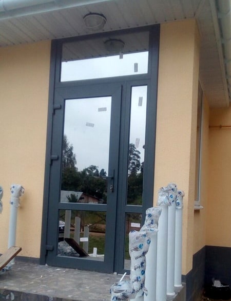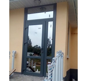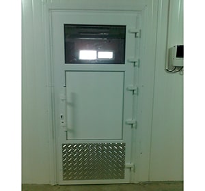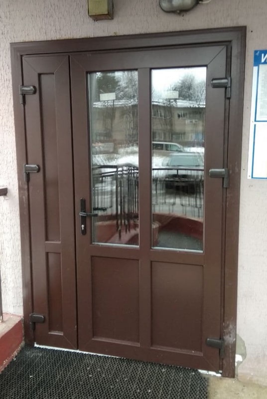 Для защиты низа двери или иных конструкции от ударов ногами возможно использование металлической полосы(отбойнка), который монтируется на низ дверной створки и защищает створку и заполнение от ударов. В качестве отбойника чаще используется рифленный алюминиевый лист 2мм серого/металлического цвета. Предварительно устанавливается дополнительный импост на створку. Сроки изготовления увеличиваются на 1-2 дня, стоимость с установкой около 100,00 руб/1 створка. В алюминиевых дверях возможно установка специального цокольного/доборного профиля для защиты нижней части створки, в дверях из пвх профиля возможна только установка отбойника.