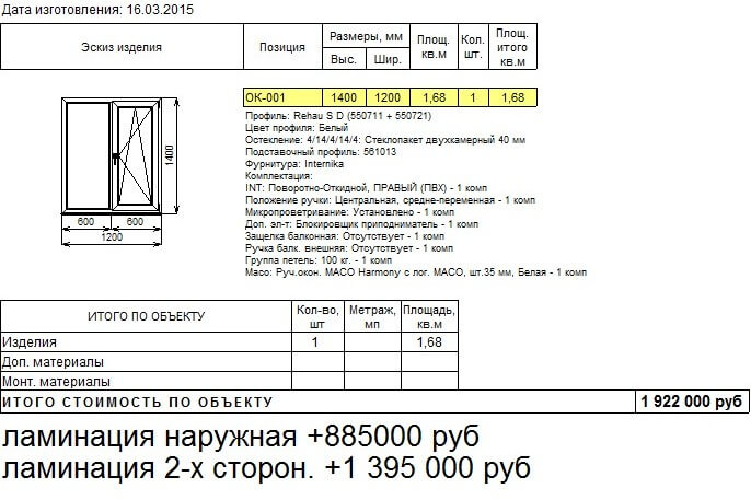 Для примера расчета ламинации на типовом "кухонном" двухстворчатом окне 1300*1400мм: