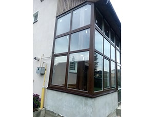 2. На угол оконного проема ставят опору из металла или бетона (менее распространенный вариант). В таких случаях остекление как бы «обходит» опору и также, как в первом варианте, применяется соединительный профиль системы. Кроме того, остекление может монтироваться в опору проема.