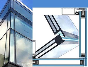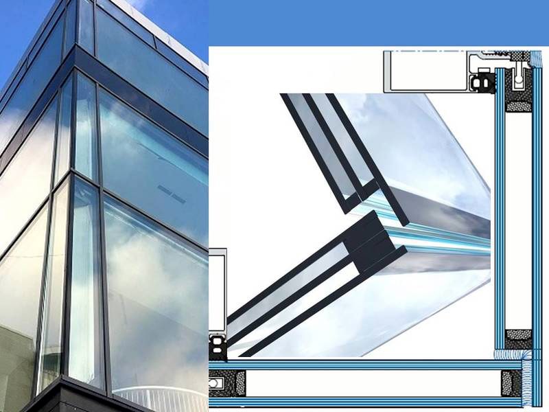 3. Структурное остекление (самый редкий вариант). Представляет собой угловое окно без несущей опоры и соединительного профиля оконной системы. В таких случаях в качестве материала оконной системы применяют «теплый» алюминиевый профиль, а в качестве узла соединения — специально спроектированные стеклопакеты. Узел углового окна в таком случае выглядит как эстетичная тонкая полоска. Но нужно учитывать, что для реализации такого остекления потребуются дополнительные затраты на более дорогое алюминиевое остекление, сложные стеклопакеты и их установку.
